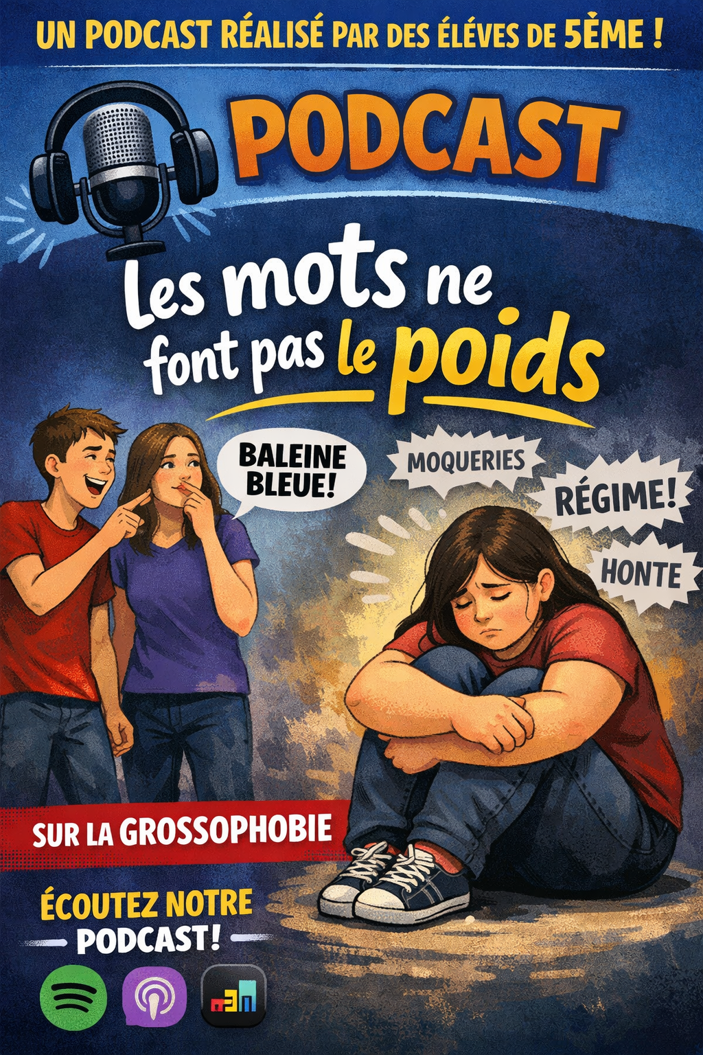 Dans le cadre du thème "lutter contre les discriminations" du programme d'EMC (Enseignement Moral et Civique) de 5ème, les élèves de 5ème 6 ont réalisé des podcasts sur le thème de la grossophobie, par groupes de 4 ou 5, chacun ayant un rôle à tenir.
